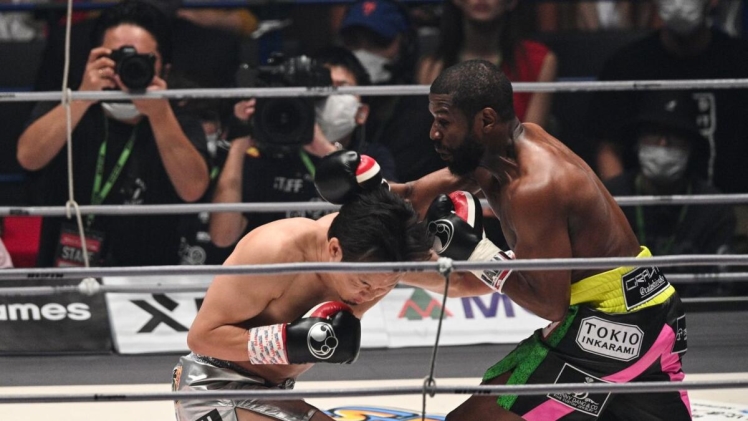 US boxer Floyd Mayweather (C) reacts after his victory over Japanese mixed martial artist Mikuru Asakura in the second round of their exhibition boxing match at the Saitama Super Arena in Saitama on September 25, 2022.
